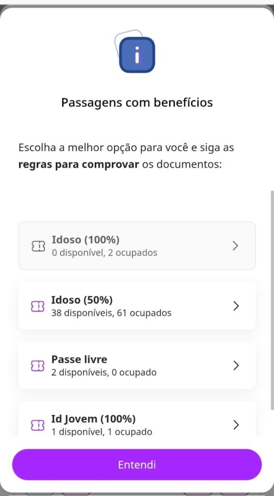 - Passagens com benefícios (Exclusivo para idosos, Passe Livre ou ID Jovem)