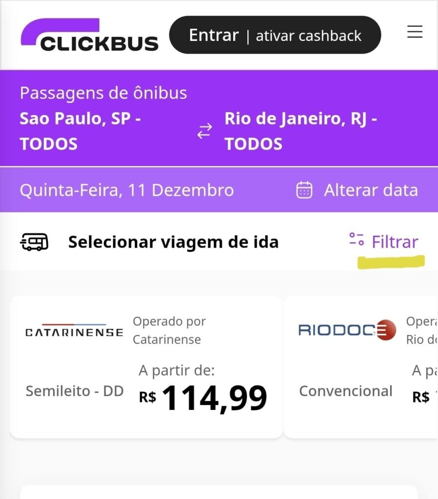 Após pesquisar a data e o destino, clique em Filtrar
